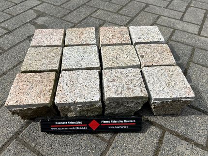 - Granit Grau-Gelb-Rot Pflastersteine, Oberfläche gesägt und geflammt, Kanten gespalten und Fugen gesägt, Format: 10x10x8 cm